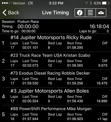 2:30 to 3:00 pm -- Podium Race. Start positions: #73, #14, #3, #23, #88. The Podium Race took place on an extended 2.1 mile track. When the race began #14 passed #73, then #3 passed #73. #88 passed #23 for 4th, then passed #73 for 3rd. #23 passed #73, then #73 passed #23, and then #23 passed #73. Morgan's #88 made a clean pass of #3 for 2nd, but #3 lost it, sliding into #88 spinning both off track in a cloud of dust. Two laps later #88 was black flagged for the dust up and penalized with a 2 minute stop on pit lane. [Check the videos above right to see for yourself. No appeal was made because Morgan had already won the points trophies.] Morgan returned to the course in 5th, finishing in that position.
